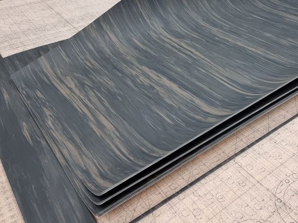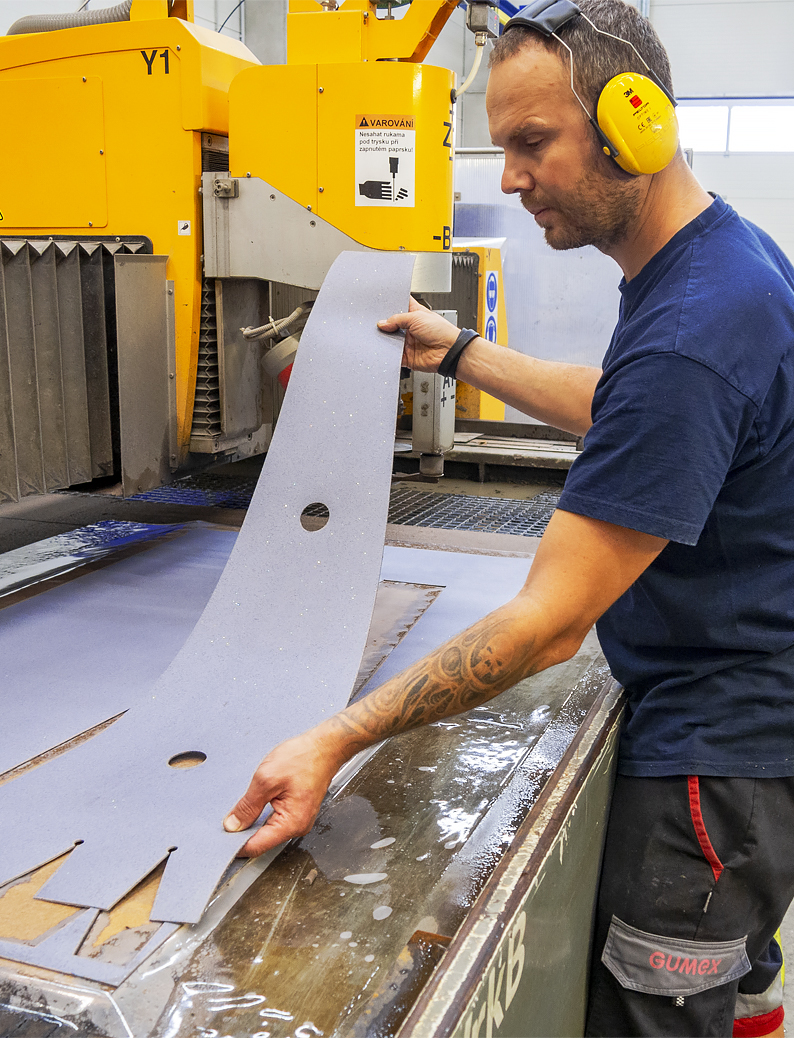 Pri podlahovine do šírky 1 500 mm sme schopní rezať výrobky až do dĺžky samotnej rolky, napríklad aj 20 m, pri podlahovine šírky 1 500-2 000 mm režeme maximálnu dĺžku 1 500 mm. Na rezanie využívame vodný lúč, kde je rezná plocha 1 500 x 3 000 mm. Avšak podlahoviny sme schopní rezať aj ručne, rozmerový limit preto nemáme. Limitom je iba to, že ručne môžeme prevádzať len rovné rezy. Hrúbka nás nelimituje - podlahoviny sú väčšinou v hrúbke maximálne 20 mm, ktorú bez problémov reže náš ploter.